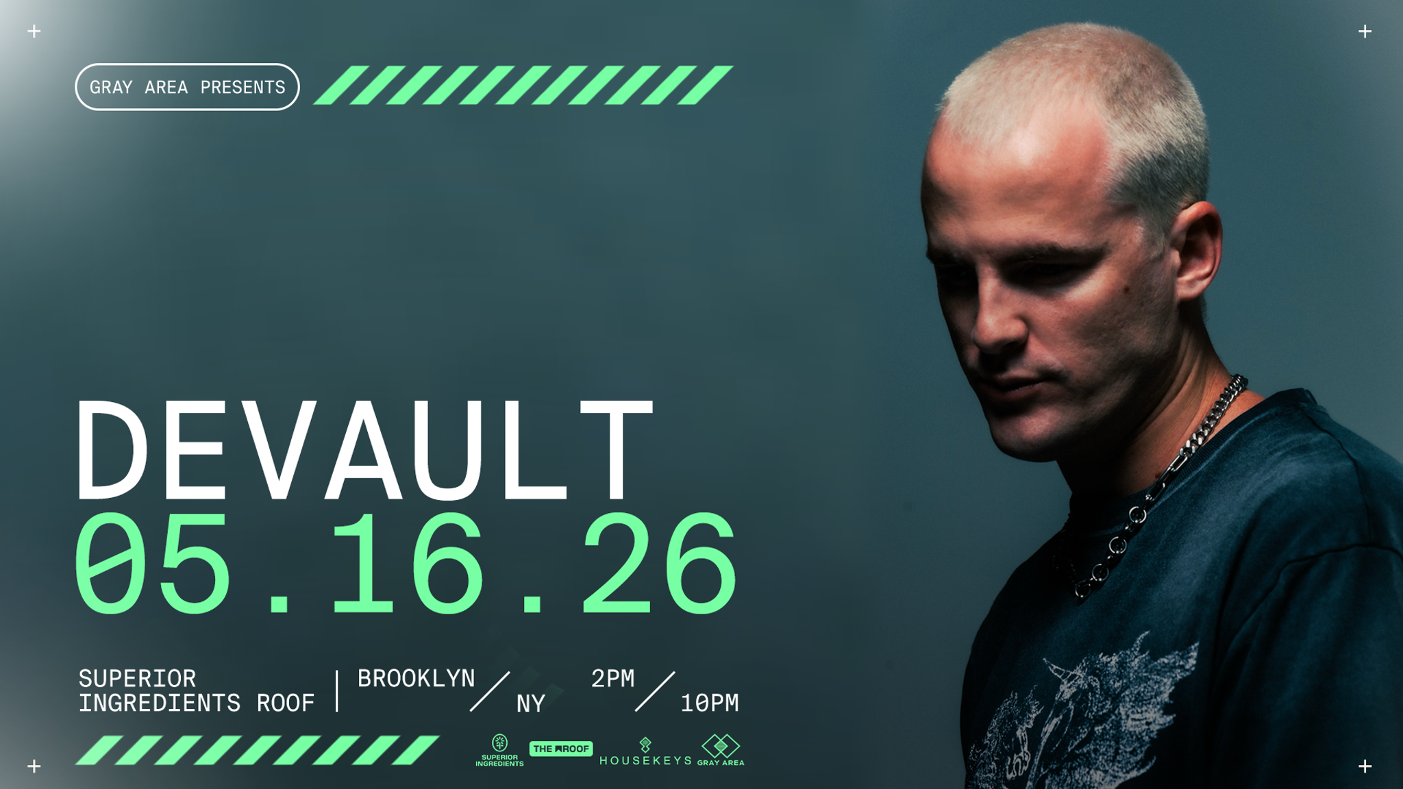 Now stepping into 2026 with his biggest year in sight, DEVAULT arrives at Superior Ingredients ready to prove why his name keeps popping up on lineups that matter. May 16th is your chance to catch him under open sky, on one of NYC’s best rooftops, with the kind of sound that hits clean, dark, and loud where it counts.