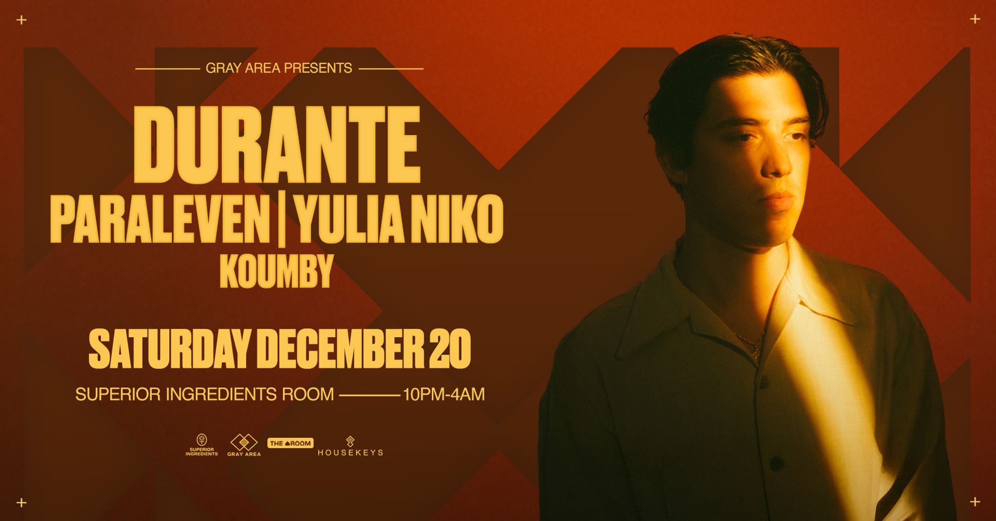 Experience Durante up close at Superior Ingredients Room — a dark, focused dancefloor with a finely tuned sound system that’s perfect for deep sets and late-night journeys. Music goes from 10PM–4AM, so don’t miss your chance to dial in for a special night.