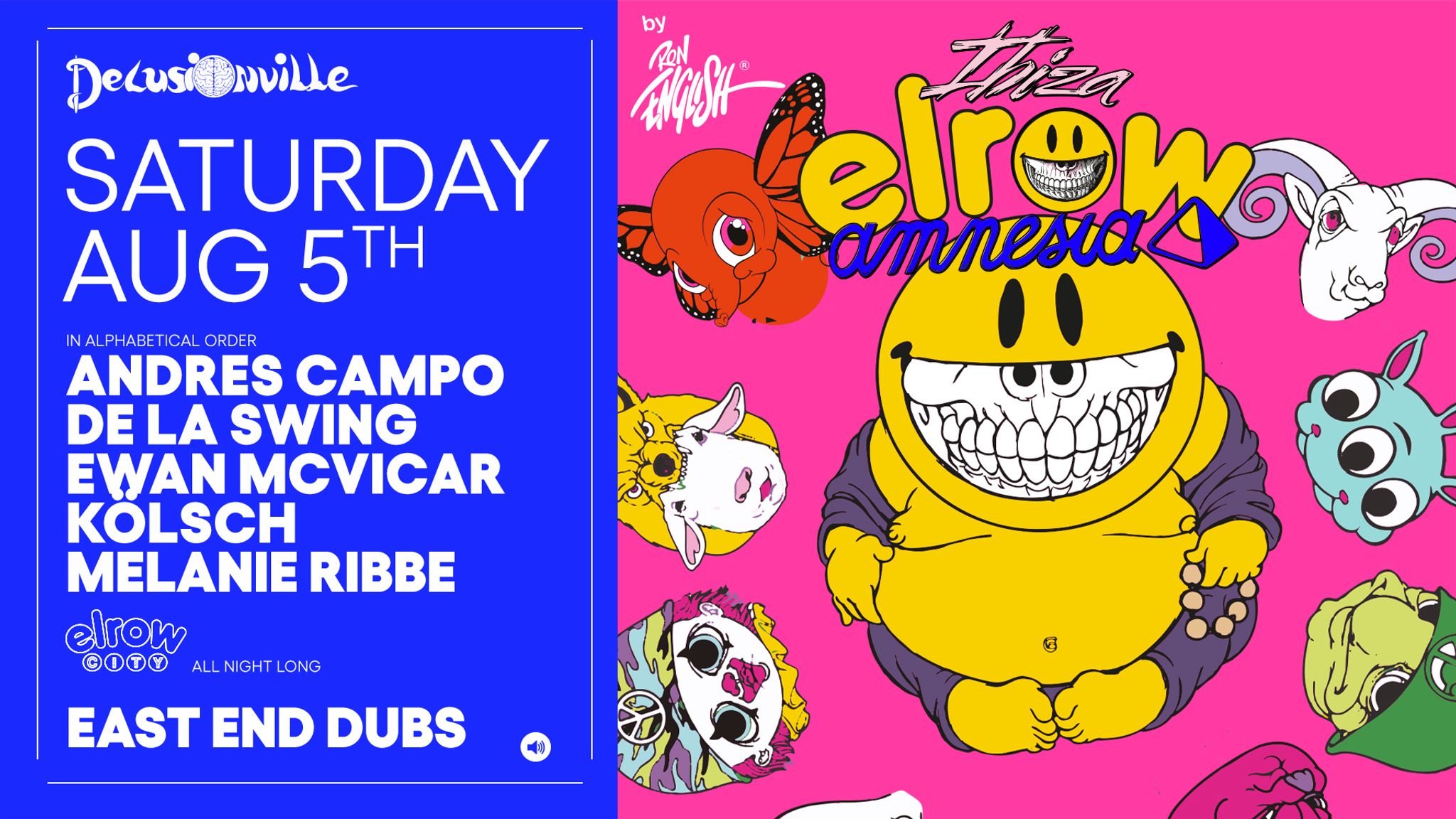 Step Into Delusionville with elrow at Amnesia Ibiza on August 5. There's another incredible Saturday night brewing at Amnesia Ibiza, and this one promises to be nothing short of spectacular. The visionary folks at elrow have their eyes set on transforming the iconic club into a vibrant wonderland, Delusionville, for you to get lost in and enjoy from 11pm on Saturday, August 5. Say adiós to the ordinary, and welcome the surreal for a night. As your feet step into elrow, you’ll discover that the legendary Amnesia has been transformed into the whimsical world of Delusionville, an upside-down paradise birthed from the mind of street art godfather Ron English. Get ready to lose yourself in an underground realm where metamorphic landscapes pulsate with energy, and anthropomorphic animals navigate a world laden with ecstasy and heartbreak. Imagine Aesop's Fables meshed with George Orwell's Animal Farm, then sprinkle it with the signature elrow party magic. Makes sense? It doesn’t have to. If elrow parties are renowned for their exquisite lunacy, Delusionville turns the dial up a notch! An explosion of color, mind-boggling decor, larger-than-life characters - everything you've come to love about elrow but steeped in the heart of pop art culture. And don't forget those inflatables! As they rain from the sky, be sure to grab one to add an extra layer of wildness to your own look for the night. With a narrative centered around a spaceship full of alien rabbits and their underground escape from wolves, elrow invites you to dive into a world where the boundary between reality and delusion blurs. As Ron English says, “If you believe, it doesn't have to be true.” What about the beats that fuel this extraordinary night? This edition of elrow brings together an ensemble of world-class DJs who will curate the perfect soundtracks for your journey through Delusionville. On the Terrace, prepare for electrifying sets from Andres Campo, De La Swing, Ewan McVicar, Kölsch, and Melanie Ribbe. Meanwhile, the Main Room, lovingly known as elrow City, will be under the control of East End Dubs all night long. As always, elrow is more than just a party; it's an immersive journey into a world where time stands still, and joy reigns supreme. The lineup Spain's Andres Campo is globally acknowledged for his innovative talent and versatility in music selection, from groove to heavy techno. Aside from captivating global audiences with his performances at renowned festivals and his residency at Barcelona's 'techno cathedral', Florida 135, he's also a respected producer with releases on labels like Second State, Intec, and RUKUS, and a record label co-founder of EI8HT alongside Eats Everything. De La Swing has been an elrow resident since 2010. Depth, darkness and fun are always present in his sets, allowing a crowd to go on a journey with him. He has the incredible ability to create a different story every time, while establishing a unique connection with the crowd. Scottish DJ Ewan McVicar’s debut single “Tell Me Something Good”, released in 2021, turned heads around the world. It went on to win ’Track of the Year’ for DJ Mag Best of British accompanied by Radio 1’s ‘Electronic Track of the Year’. Kölsch is no stranger to the White Isle, having played Ibiza favorites DC-10, Ushuaïa, and Pacha to name just a few. His other global accolades include his time behind the decks at Berghain/Panorama Bar, his live stream to 8 million people from the top of the Eiffel Tower, and festivals such as Tomorrowland. From model to DJ, Melanie Ribbe shows so much passion throughout her sets and will bring her infectious energy to Amnesia Ibiza for elrow. Nicknamed the ‘Angel of Techno’, she’s no stranger to Ibiza and has played regularly in past years. Not only a master producer and DJ, East End Dubs runs his own label as well as engineers for plenty of other artists and record labels. The London producer has made a name for himself with deep and dark house sounds, inspired by London’s underground scene.
